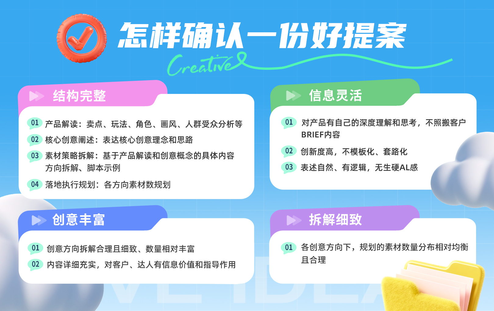 服务商提案的质量,是后续素材高质量交付的关键前置保障,其评估需聚焦 “结构完整、信息灵活、创意丰富、拆解细致” 四大核心标准。