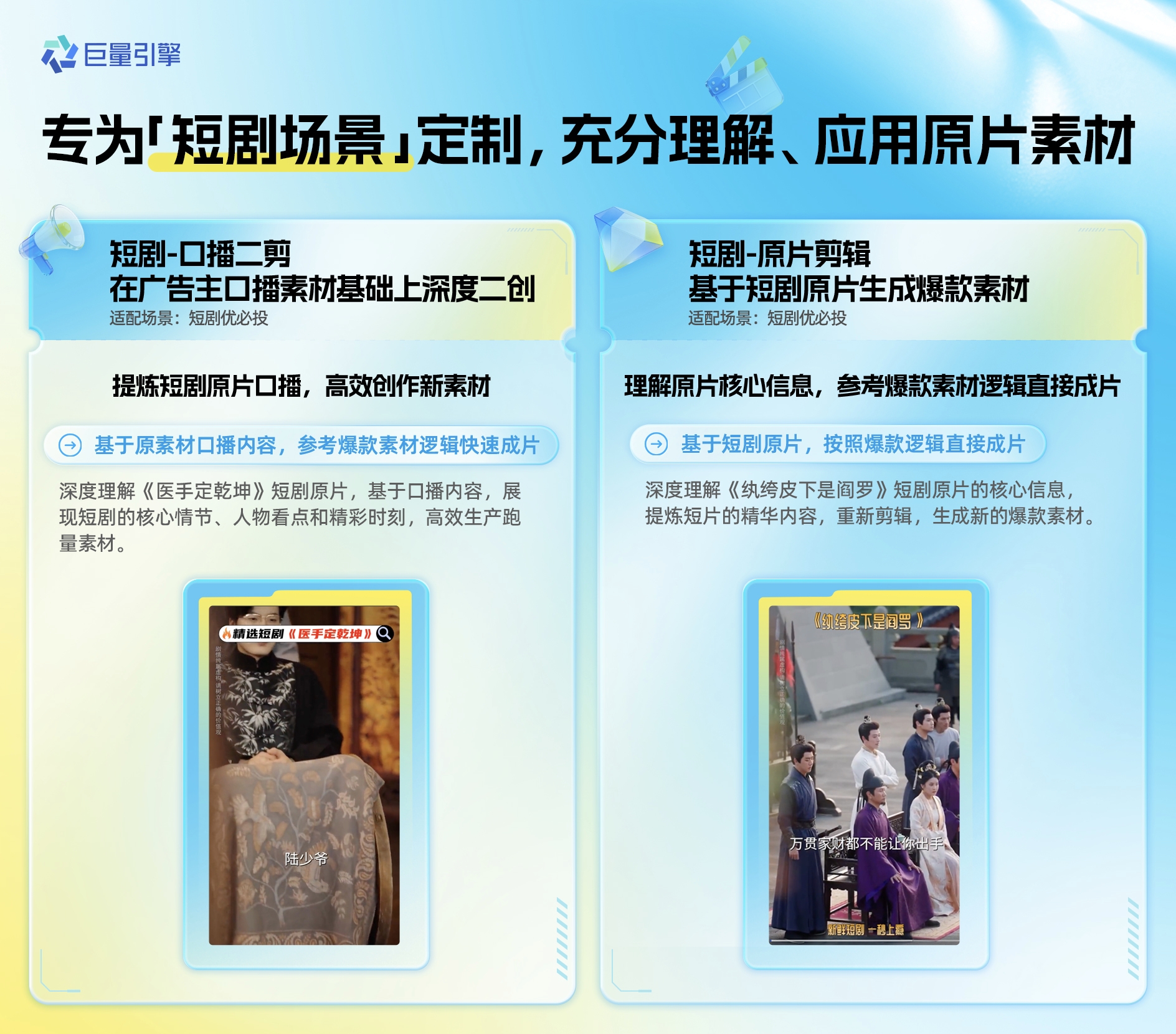 当前,短剧营销火热,正成为品牌抢占用户心智的关键。在短剧场景下,如何高效产出优质素材?「短剧-口播二剪」精准提炼原素材的口播内容亮点,深度理解原片,契合爆款逻辑生成新的视频,助力广告主达成更优营销效果。无需依赖复杂剪辑,「短剧-原片剪辑」会基于短剧原片的核心信息,按爆款素材逻辑,直接生成高质量视频素材,省时省力,助推广告主在短剧赛道快速布局、抢占流量。