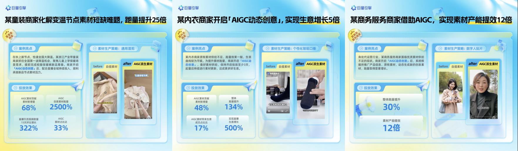 凭借智能基建提升素材供给,以及素材高效汰换能力,「AIGC 动态创意」助力多行业的商家提升跑量效果,降低人力成本。服饰、维修、短剧、游戏行业等优秀商家,已率先使用「AIGC 动态创意」,高效生产好内容,助攻好生意。