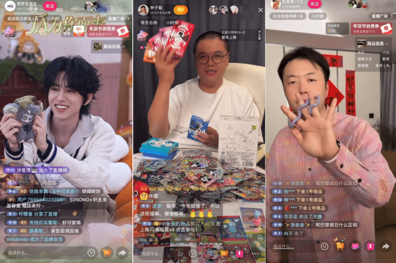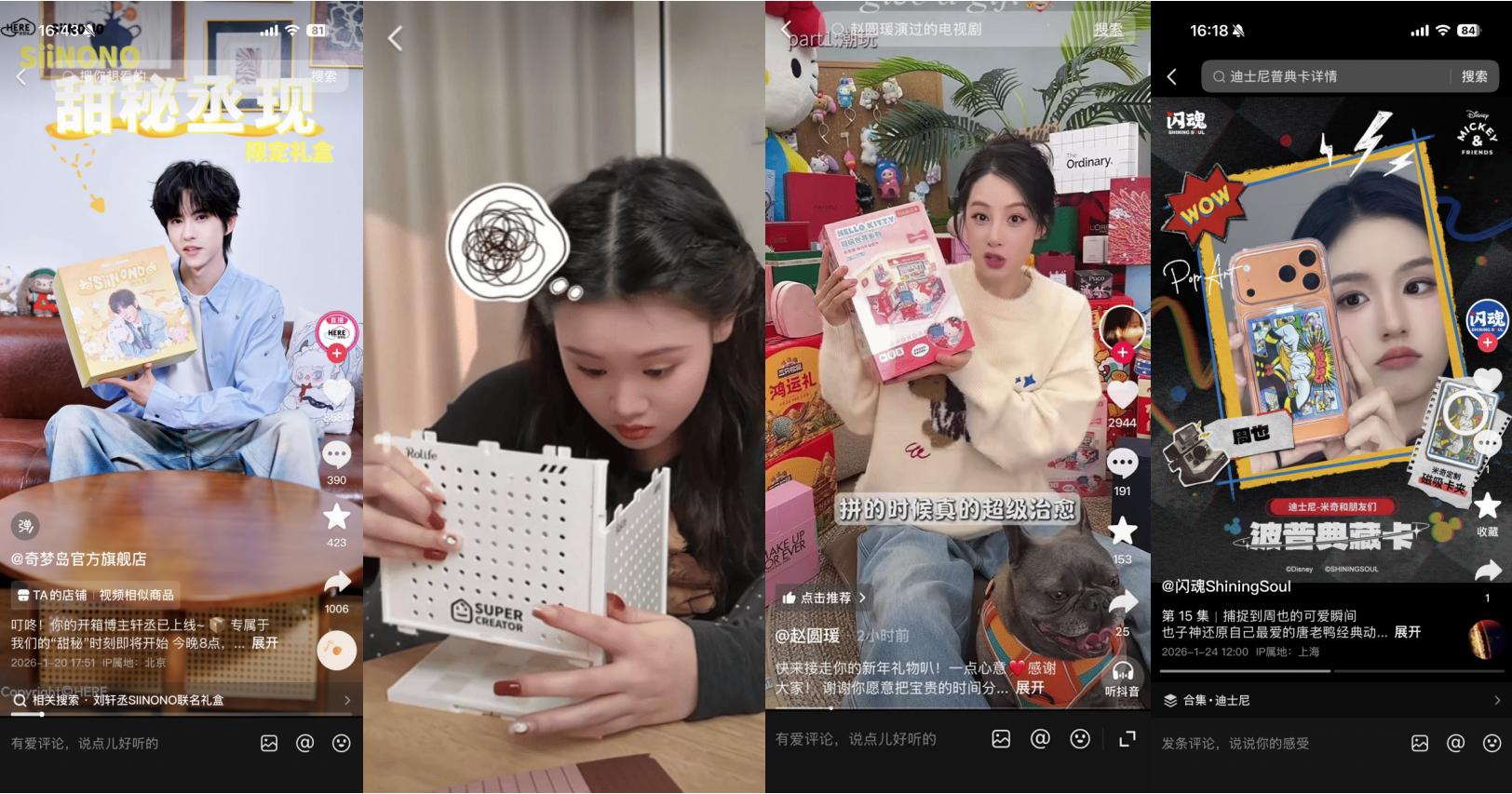 活动初期,通过明星/头部达人的短视频种草,品牌们迅速建立新品认知:奇梦岛邀请刘轩丞担任SiiNONO全球大使,同步推出SiiNONO甜秘丞现限定礼盒,SiiNONO软萌治愈的设计与共情式叙事,备受粉丝和潮玩爱好者的青睐;闪魂联动周也、卢昱晓、程潇等多位明星发布种草内容,强化新品“收藏级”认知,同时产品拓宽了卡牌的展示场景,打造定制挂件和磁吸卡夹,多位明星种草把藏品变为行走的社交货币;Tangle、若来、若客等品牌则通过杜海涛、赵圆瑗等明星的短视频种草,快速触达大众圈层,#杜海涛原来在潮玩赛道、#谁能拒绝赵圆瑗的潮玩年货、#茂茂林子聪来抖音摆潮玩摊了、#张家齐的潮玩阿贝贝绝了 等相关话题纷纷登上抖音热点榜。