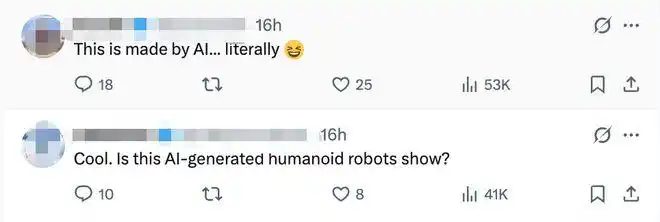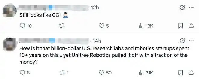 推文的评论区充斥着惊叹与难以置信:“这是AI生成的吗?”“这些是不是人假扮的?”“为什么美国那些耗资数十亿美元的研究实验室花了十多年时间才做到的事,宇树只用了其中一小部分资金就做到了?”