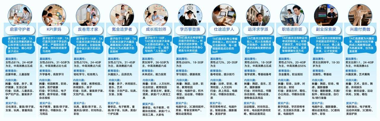 今天的教育市场早就不再是一锅端了。大家都在嚷嚷着终身学习,但从0到25岁的成长期、25到40岁的职业期,再到40岁以上的人群,大家的诉求完全不在一个频道上。有意思的是,这次活动精准地把大盘里的学习者划分成11大圈层:“启蒙守护者”、“KPI爹妈”、“反卷育才家”、“氪金造梦者”、“成长规划师”、“学历攀登族”、“仕途追梦人”、“远洋求学派”、“职场进阶匠”、“副业探索家”和“兴趣付费咖”。