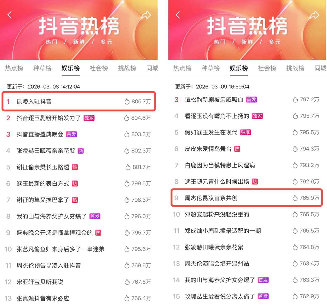 3月7日周杰伦预告引发热议,3月8日当天昆凌正式入驻,话题登顶抖音娱乐榜TOP1;次日双人共创视频发布,再登热榜。明星真实自然的夫妻互动,为核心主题带来亿级曝光,更为「生动的她」增添情感注脚——明星不再是遥不可及的符号,而是“多面女性”的生动样本。